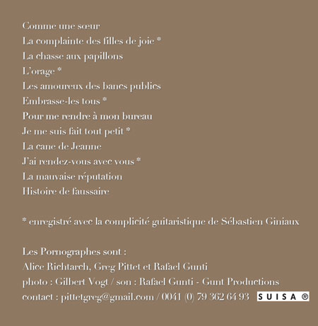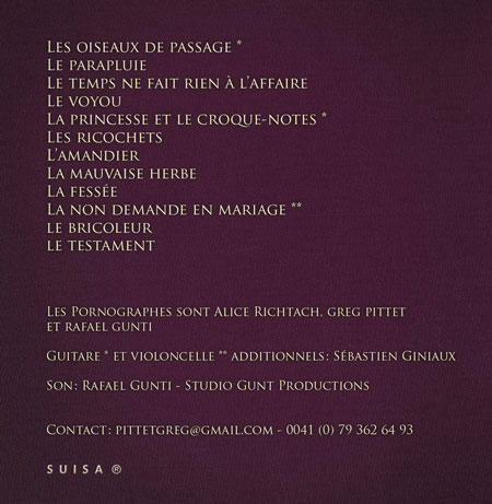 Versez CHF 20.- (ou EUR 20.-) par disque aux coordonnées bancaires ci-dessous en précisant dans le motif de paiement lequel(s) vous désirez. Les frais de port sont compris et nous nous ferons un plaisir de traiter votre commande dans la semaine dès réception de votre versement. Merci ! Bien à vous, Les Pornographes. * Attention, pour les envois vers des pays autres que la Suisse, les douanes peuvent prélever des taxes à la charge du destinataire. * Coordonnées bancaires : IBAN : CH54 0026 4264 6184 20M1 L Adresse de paiement : * Contact : Pittet Grégory - 079 362 64 93 - pittetgreg@gmail.com